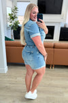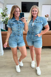 Unleash your playful side with the Delia High Rise Short Sleeve Romper. This denim romper features a button front and cuffed details for an effortlessly cute look. The medium wash and 4-way stretch provide comfort and style, while the non-distressed design keeps it classy. Perfect for a fun day out in the sun!