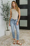 The Mallory Mid Rise Bleach Wash Boyfriend Jeans are the perfect everyday denim! A stretchy, light wash denim shapes a mid rise waist with zipper fly and five pocket cut. Relaxed pant legs with lived in fading fall to ankle length, cuffed hems. Cuffs can be unrolled.