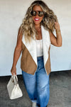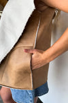Stay cozy and chic in this open-front vest featuring a soft faux suede exterior and plush sherpa lining. The relaxed fit and draped collar make it perfect for layering over your favorite basics. A warm, stylish staple for fall and winter looks.