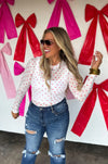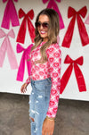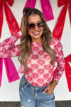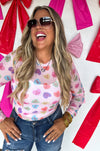 OUR VALENTINES PRINTS ARE HERE!! Super cute for layering, this sultry stretchy mesh print long-sleeve top features a totally sheer design. Perfect worn alone or paired under your favorite cardigan, vest or sweater! Crew neck and thumbhole details.