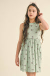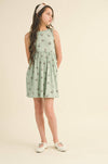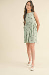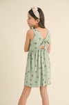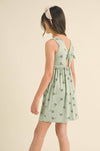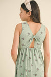 Sleeveless tie back dress with two side pockets. Features an open back with tie closure.