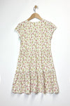 Add charm to your little one’s wardrobe with this sweet floral dress. Crafted from a lightweight, breathable fabric, it features an allover delicate pink and green floral print on a soft ivory background. The cap sleeves and V-neckline offer a classic, comfortable fit, while the wooden-style button-front detail adds vintage-inspired character. Designed with a gathered waist and tiered skirt, this dress brings a playful yet timeless silhouette that’s perfect for everyday outings or special occasions.