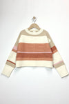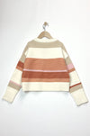 Brighten up chilly days with this cozy and colorful striped knit sweater. Featuring wide horizontal stripes in warm tones of cream, rust, peach, taupe, and soft pink, this sweater blends modern style with a playful, retro twist. The relaxed fit, drop shoulders, and chunky ribbed trims at the neckline, cuffs, and hem offer maximum comfort and a trendy silhouette.